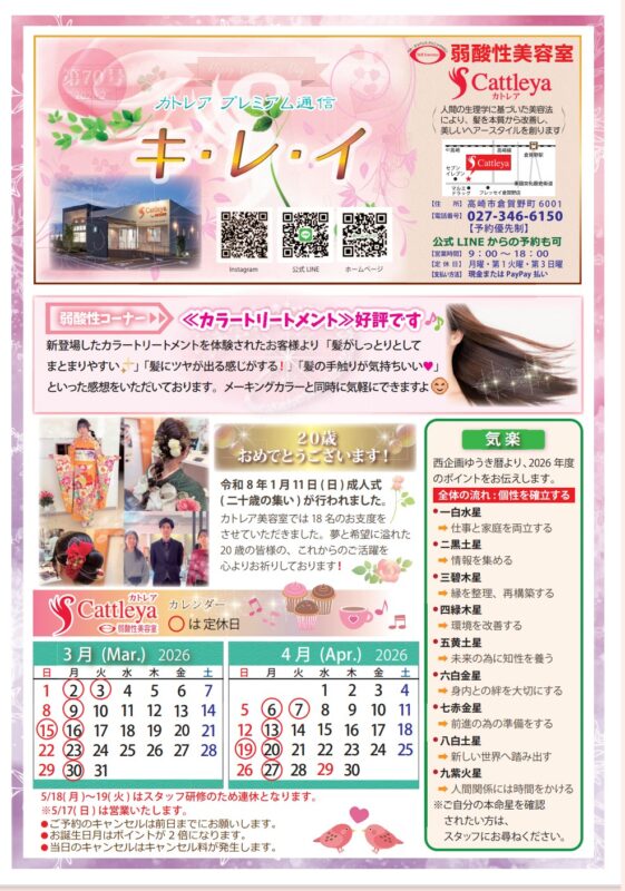今月から皆様へ『キレイ通信70号』をお配りしています😊 カトレアの事がたくさん知れるキレイ通信。お客様から『楽しみにしるよ』と言われると、嬉しくなります。今月もぜひご覧ください🙂↕️ 次回の発行は、4月1日です &nb […]